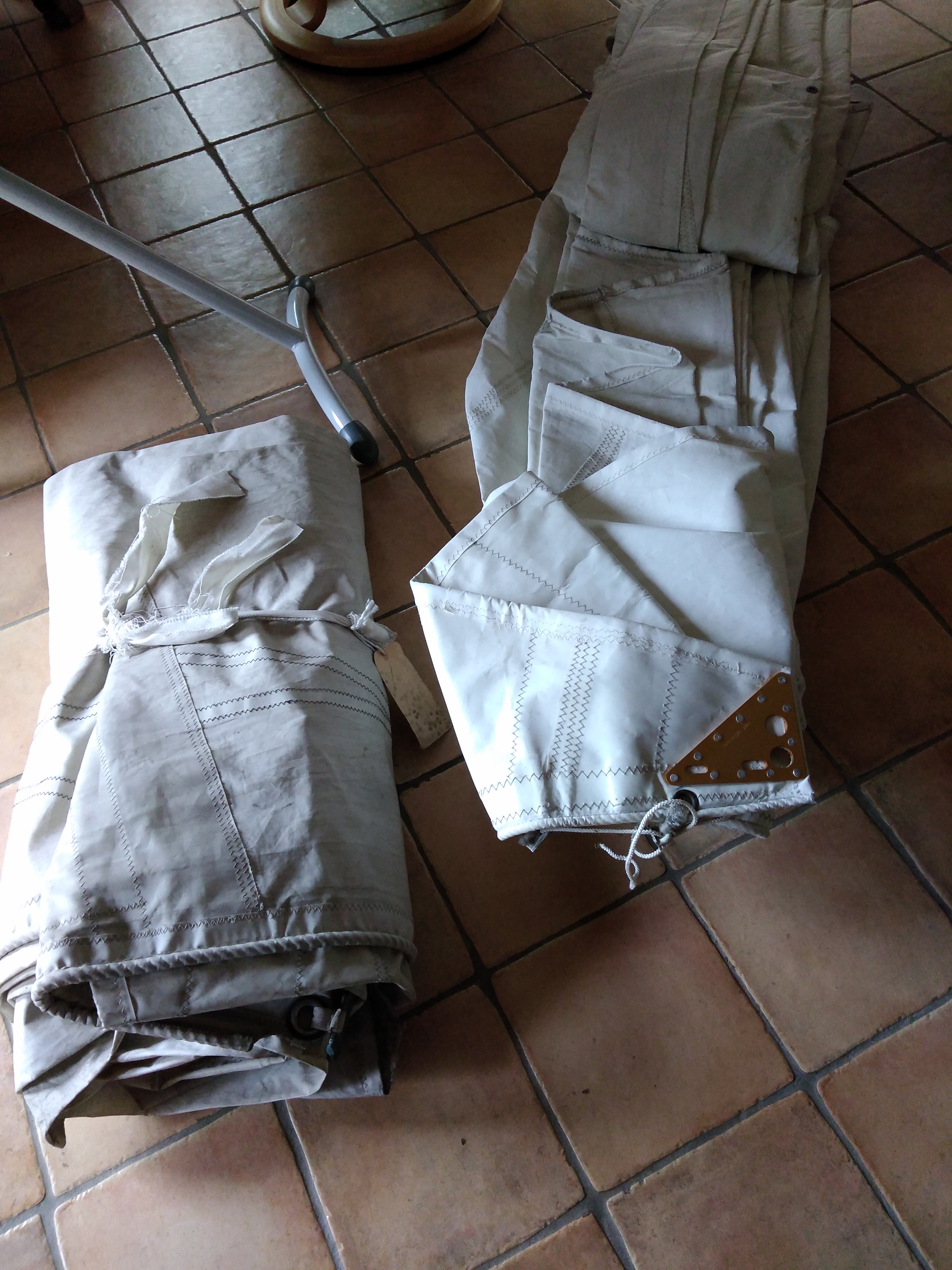En état encore pour en tirer des voiles de voile-aviron ou d'annexe ou faire des réparations sur voiles existantes.