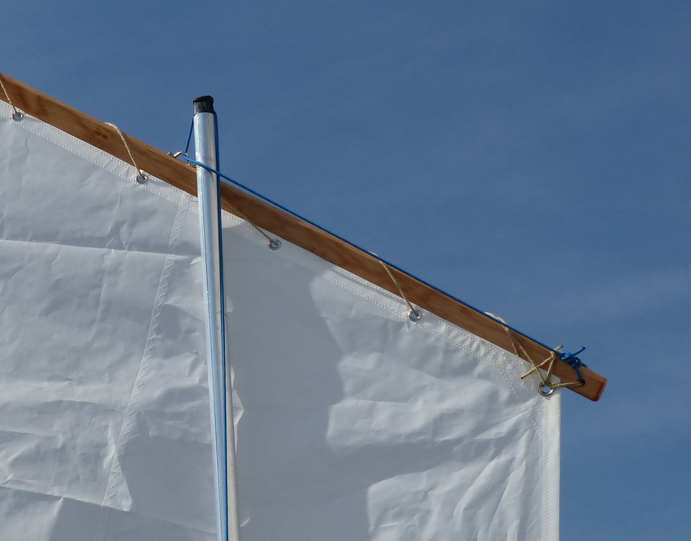 La tête. Une boucle large est fixée sur la vergue, grâce à ce principe la forte tension verticale dans la ralingue de guindant entraîne une tension dans la ralingue de gaffe. J'ai toujours un peu peur que dans le coin le tissu ne se désolidarise de la ralingue, je vais certainement renforcer davantage cette zone avec un autre œillet.