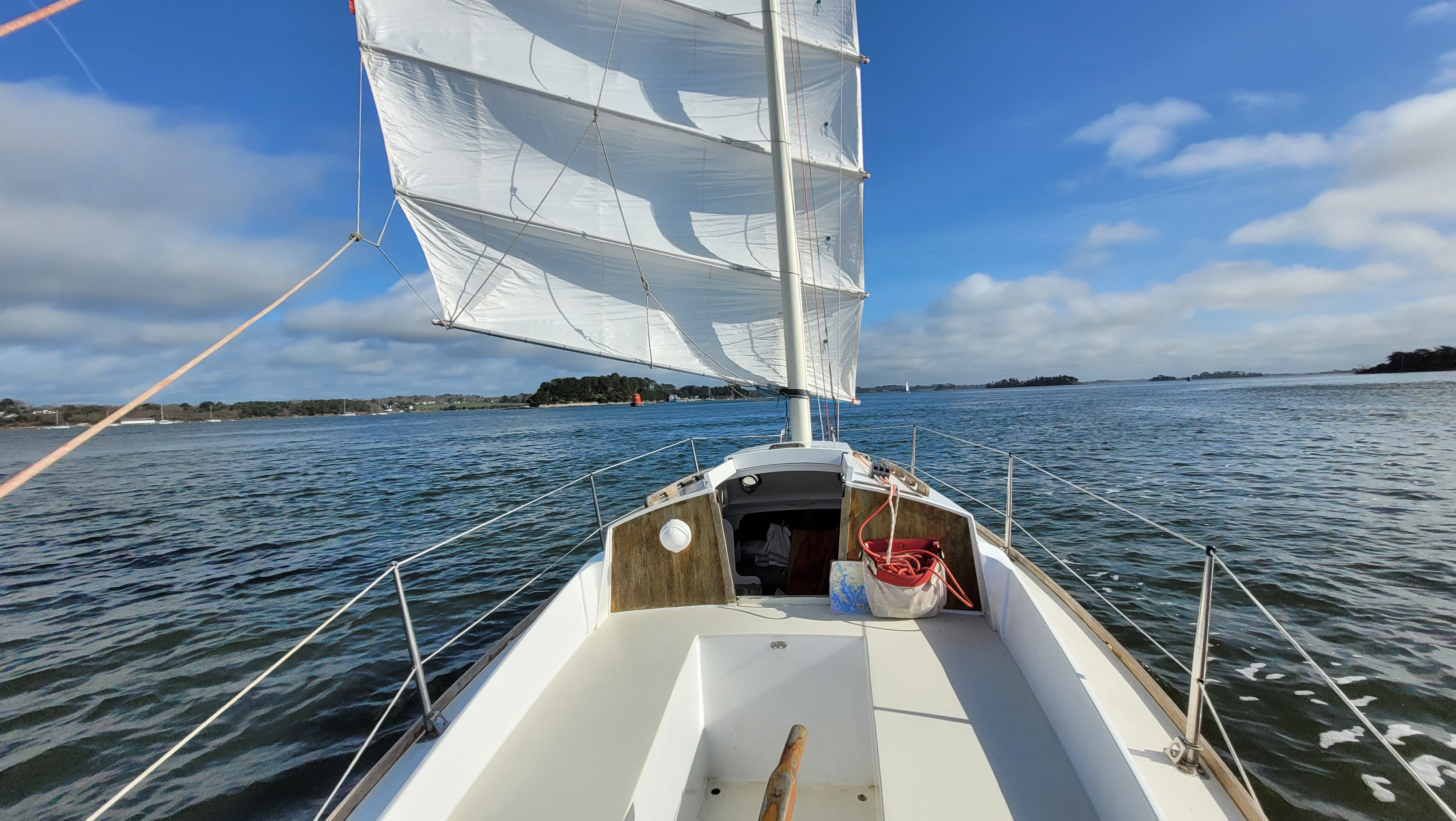 Enfin la pluie s'est arrêtée, le soleil a fini par percer à travers les nuages et j'ai pu me faire une petite navigation toute tranquille, un classique tour de l'île aux Moines et de l'île d'Arz.