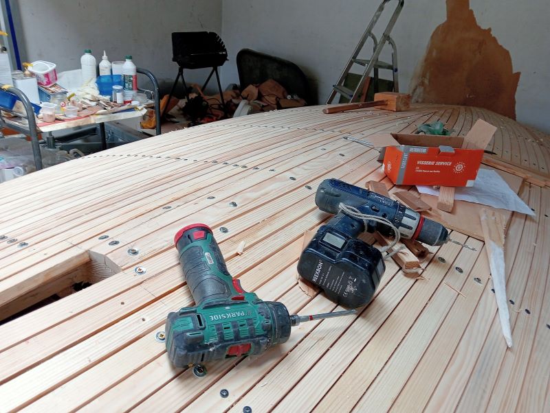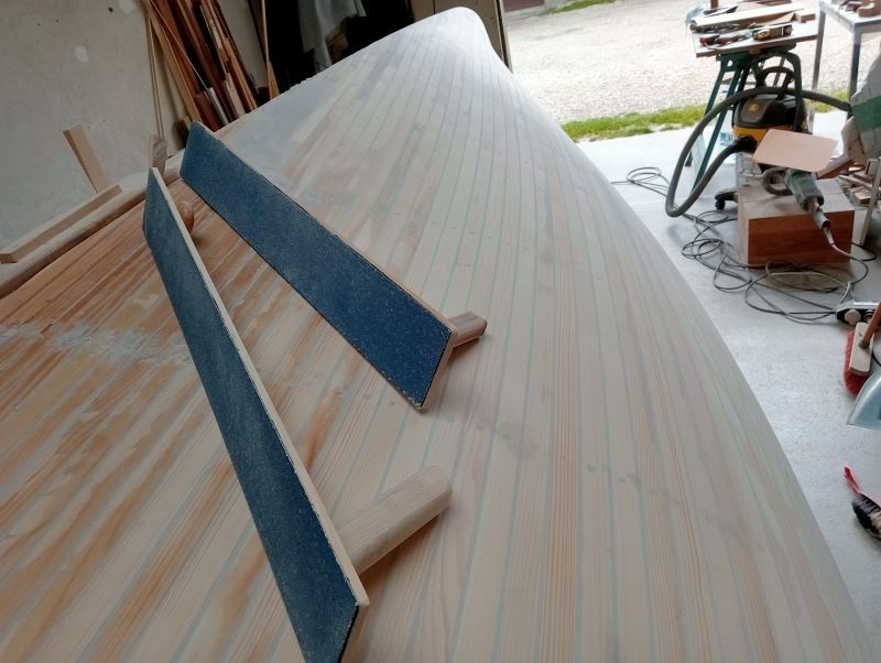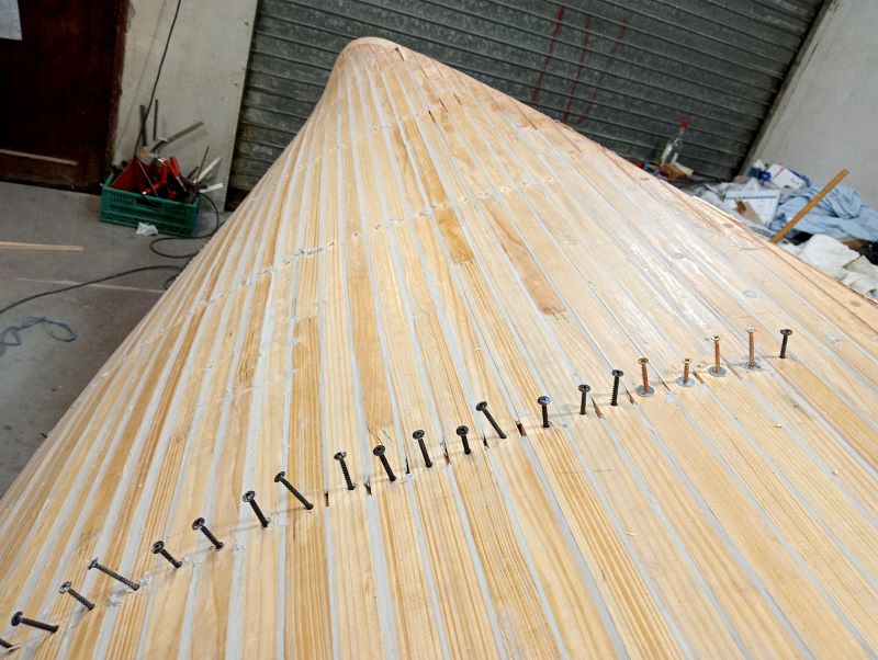 Les lattes sont en épicéa, comme la quille, les renforts intérieurs, l'étrave intérieure et la contre-étrave laminée.