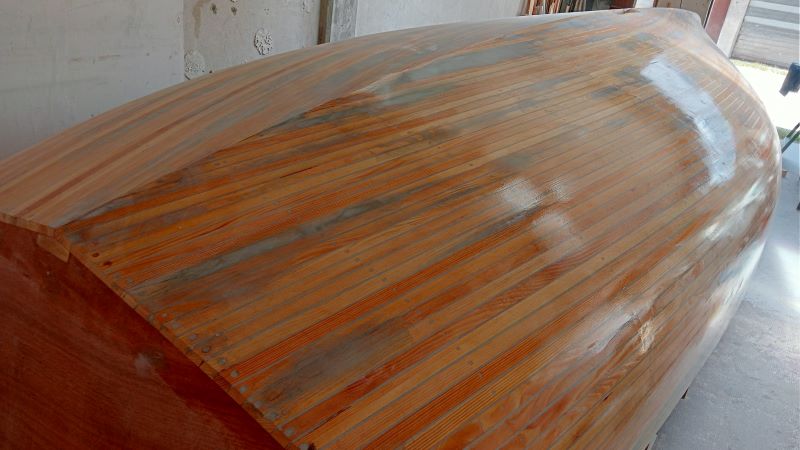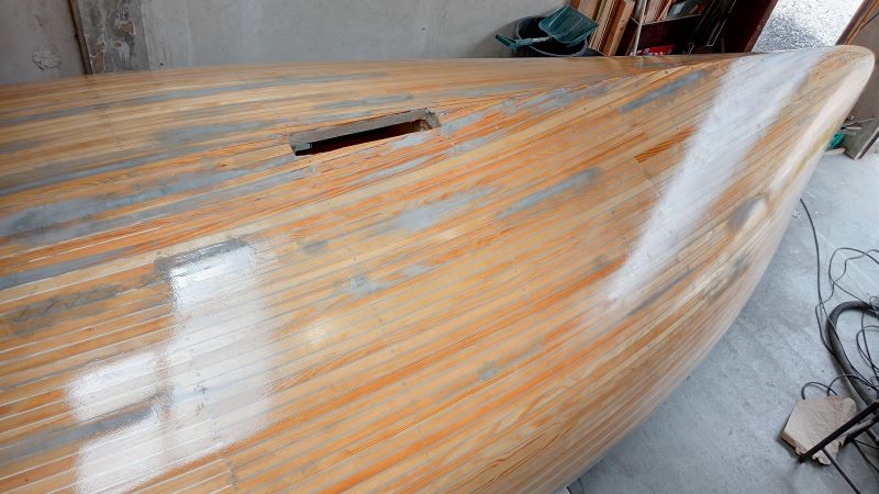 La coque n'est pas encore stratifiée, le bois est juste imprégné 2 couches (West System), je profite du brillant pour voir les défauts.