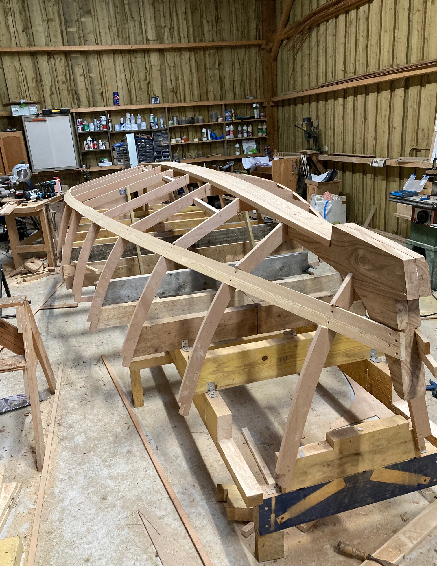 La quille est en place, le marsouin est dégrossi (j'ai passé pas mal de temps sur le plan pour savoir comment le faire) et j'ai commencé la pose des serres de bouchain.