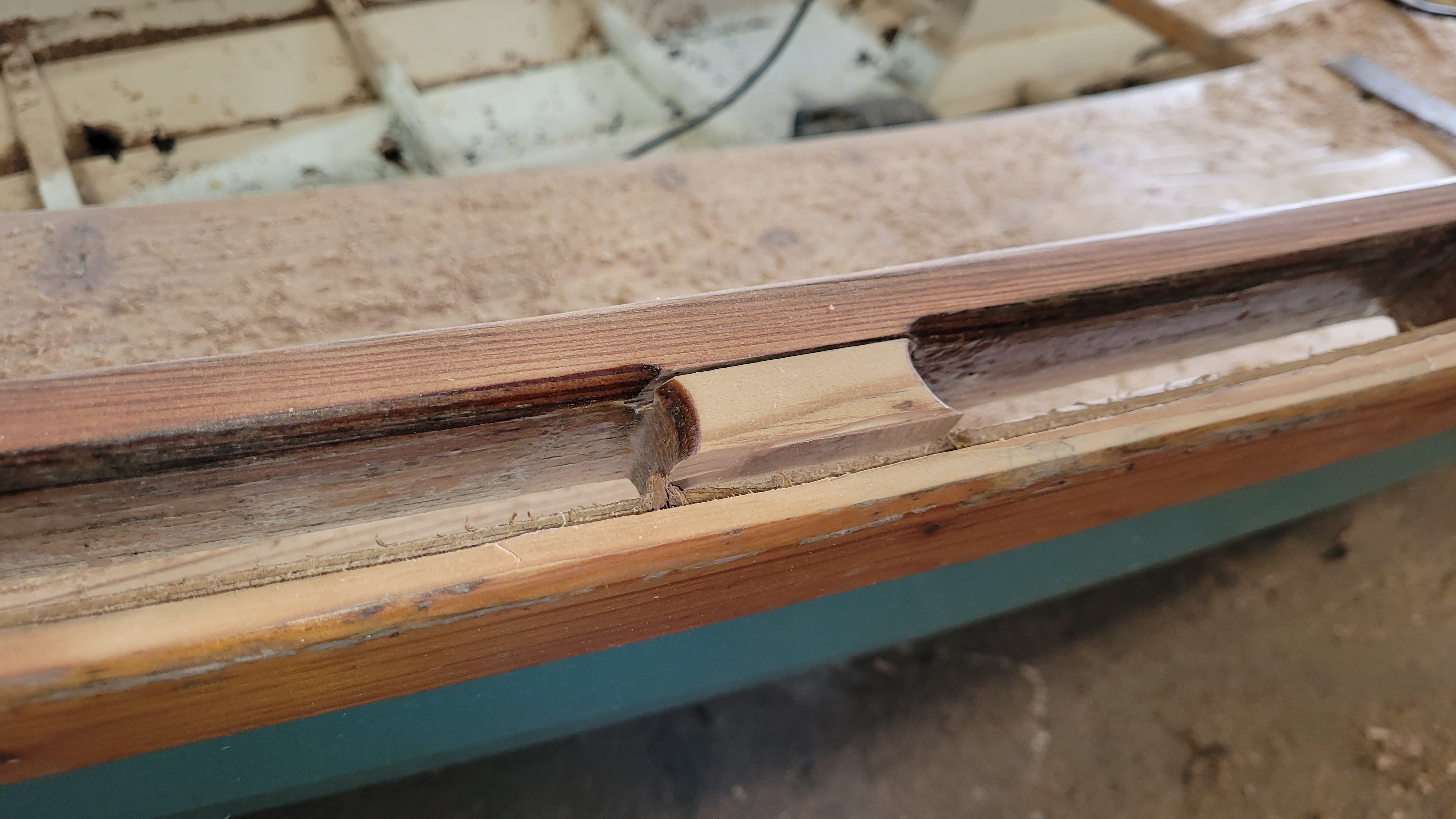 Les collages qui ont lâchés sont nettoyés à la multi-fonction, et les bords de contreplaqué sont passés à la défonceuse pour laisser la place à une baguette de bois de même largeur :