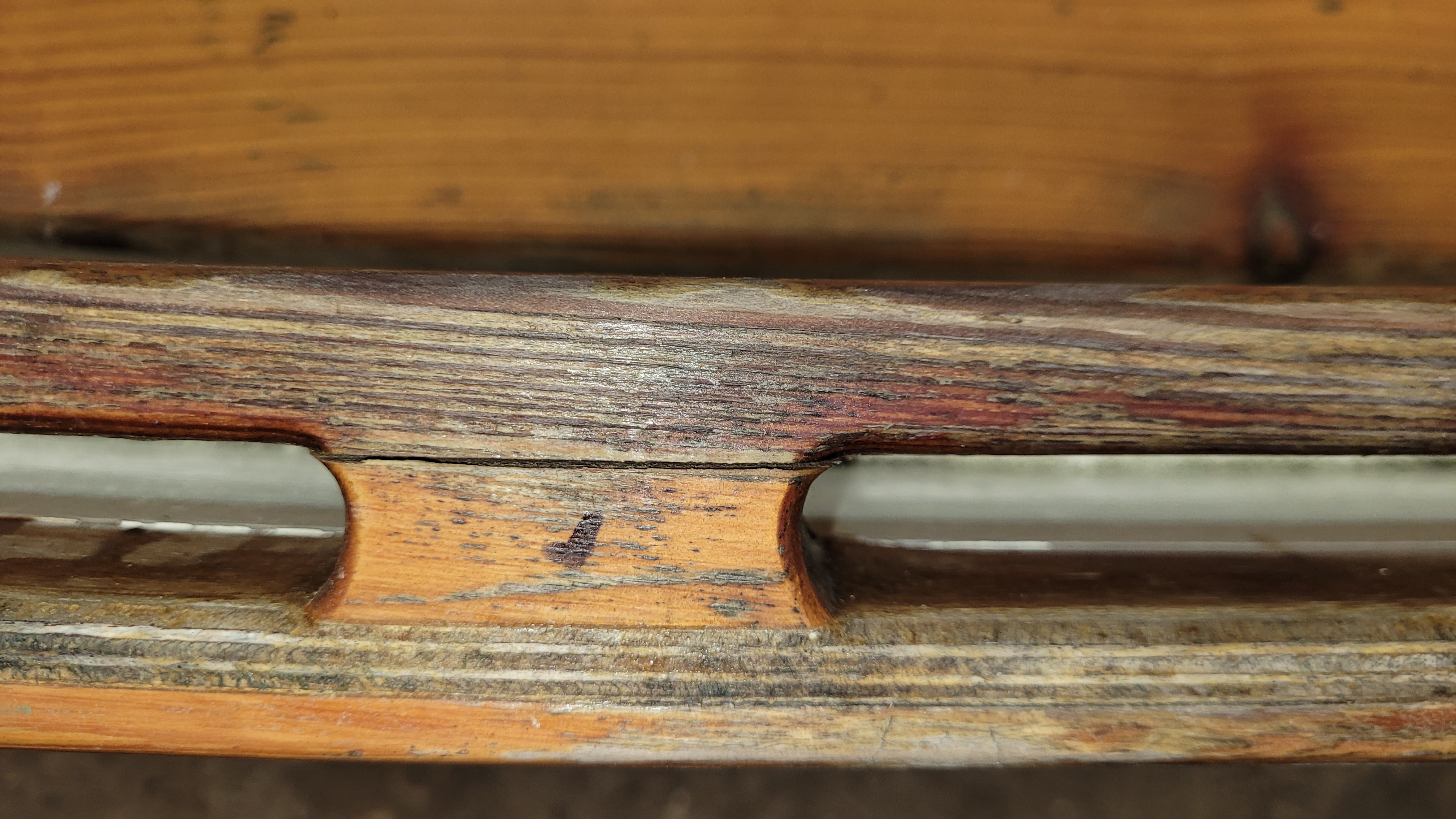 Des collages époxy ont lâchés sur la serre-bauquière, je l'avais étuvée avant collage et j'ai été trop impatient pour le coller au lieu d'attendre qu'elle soit bien sèche. Et même si j'avais bien lu que les chants de contreplaqué devaient être bien protégés, j'ai cru que époxy et vernis les protègeraient suffisamment. Évidemment non.